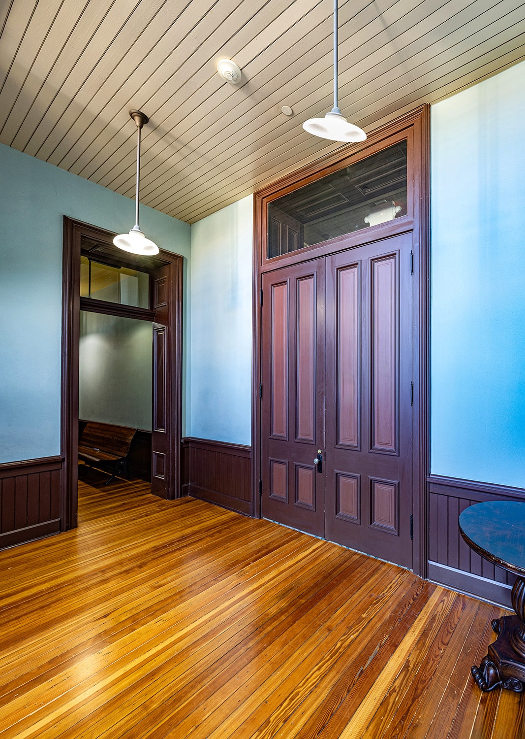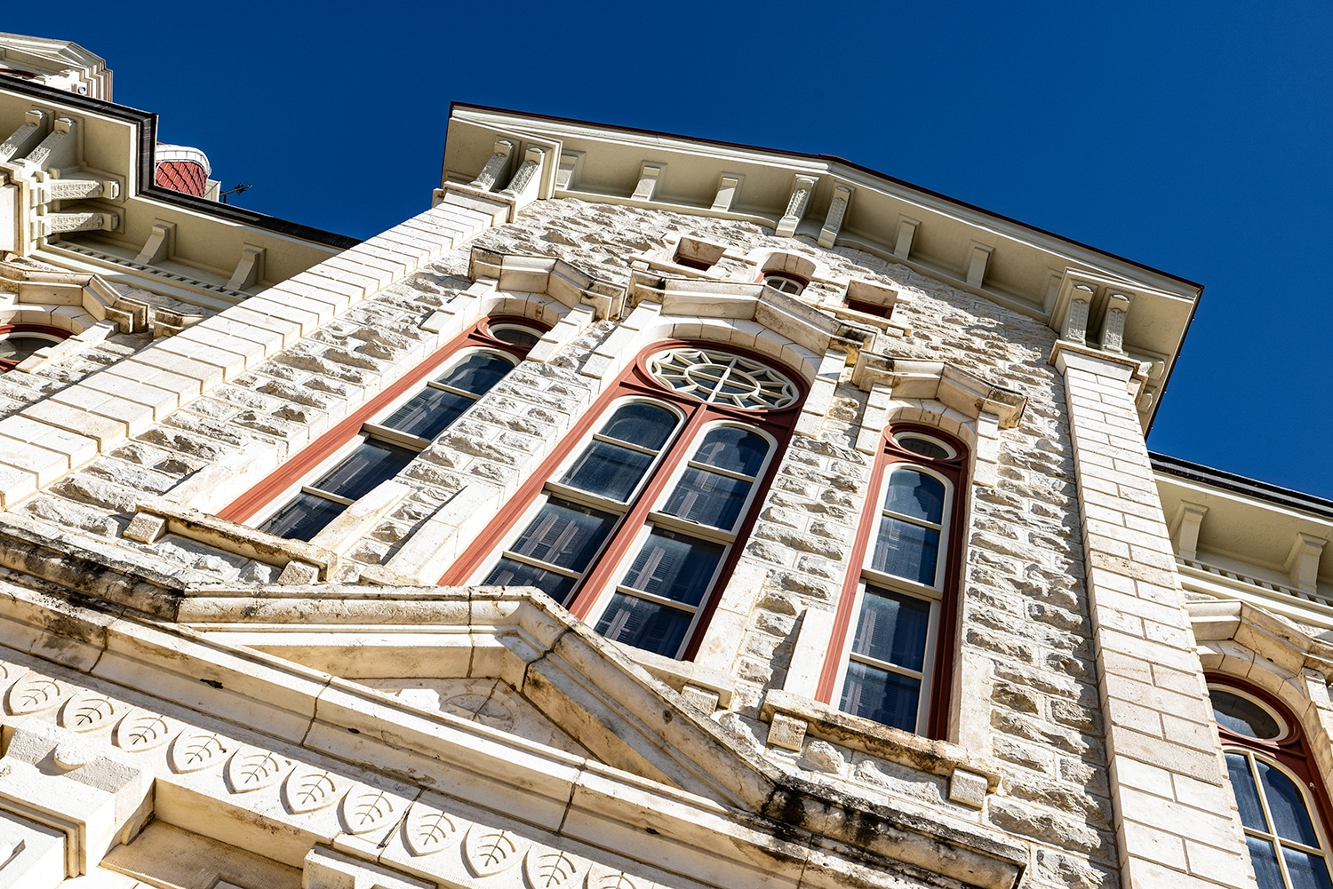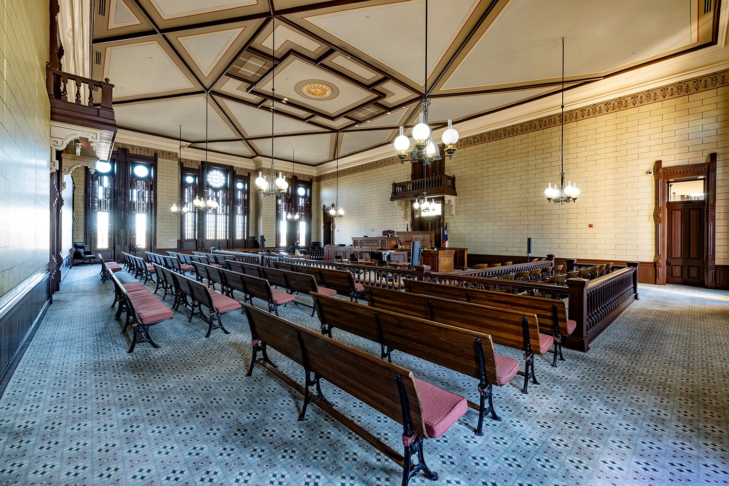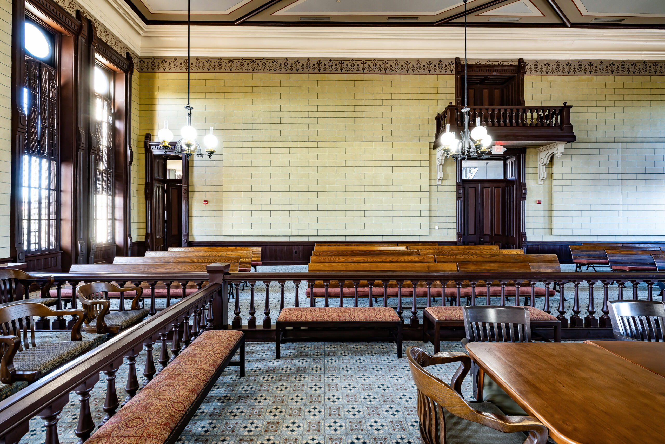 The project’s scope included roof and window restoration, investigation and repair of the courtroom ceiling, HVAC system upgrades, and the restoration of interior finishes. Throughout the process, Komatsu Architecture worked closely with the Texas Historical Commission (THC), securing necessary permits and ensuring full compliance with appropriate preservation principals.