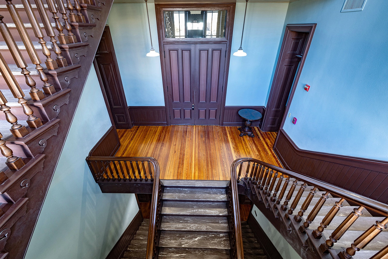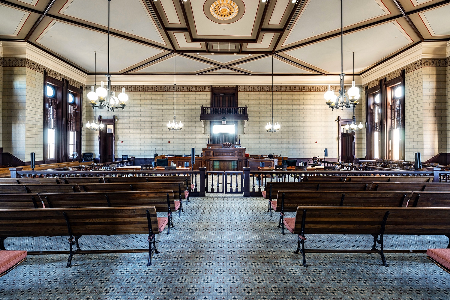 The firm prepared construction documents for both exterior repairs and interior restoration. This included work on plaster, wood flooring, and ceiling elements in the District Courtroom, addressing issues related to water damage and aging infrastructure. Komatsu also coordinated mechanical system improvements, including relocating the building’s chiller and integrating new fan coil units.